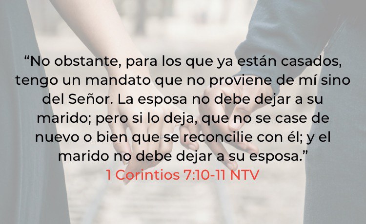 «No obstante, para los que ya están casados, tengo un mandato que no proviene de mí sino del Señor. La esposa no debe dejar a su marido; pero si lo deja, que no se case de nuevo o bien que se reconcilie con él ; y el marido no debe dejar a su esposa.» 1 Corintios 7:10-11