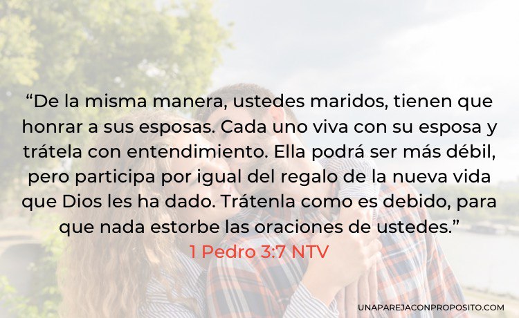 “De la misma manera, ustedes maridos, tienen que honrar a sus esposas. Cada uno viva con su esposa y trátela con entendimiento. Ella podrá ser más débil, pero participa por igual del regalo de la nueva vida que Dios les ha dado. Trátenla como es debido, para que nada estorbe las oraciones de ustedes.”